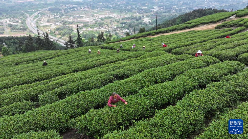 4月11日,茶农在重庆市永川区廖云祥茶树种植基地采茶(无人机照片)。新华社记者 王全超 摄