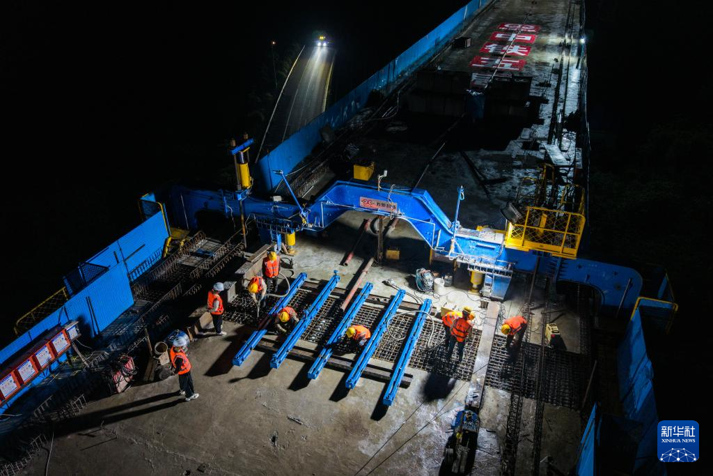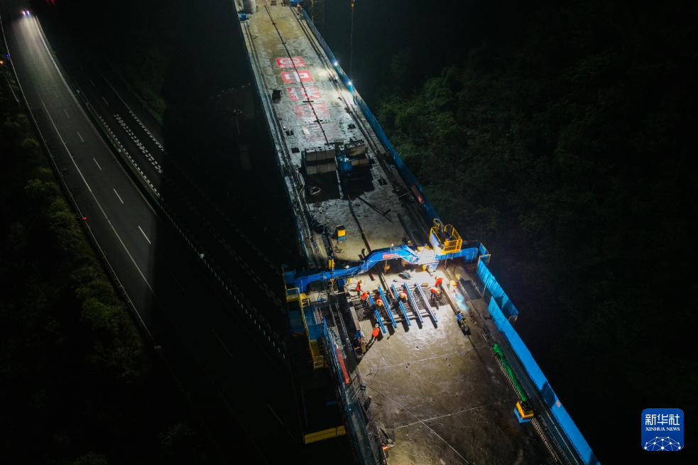 4月13日凌晨,在邵永高铁刘家院子跨二广高速特大桥建设工地,中铁五局工人在进行连续梁合龙施工(无人机照片)。新华社记者 陈思汗 摄