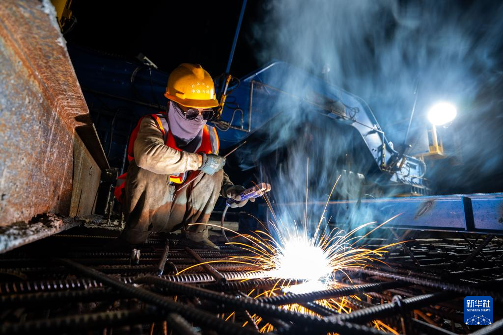 4月13日凌晨,在邵永高铁刘家院子跨二广高速特大桥建设工地,中铁五局工人在进行连续梁合龙施工。新华社记者 陈思汗 摄