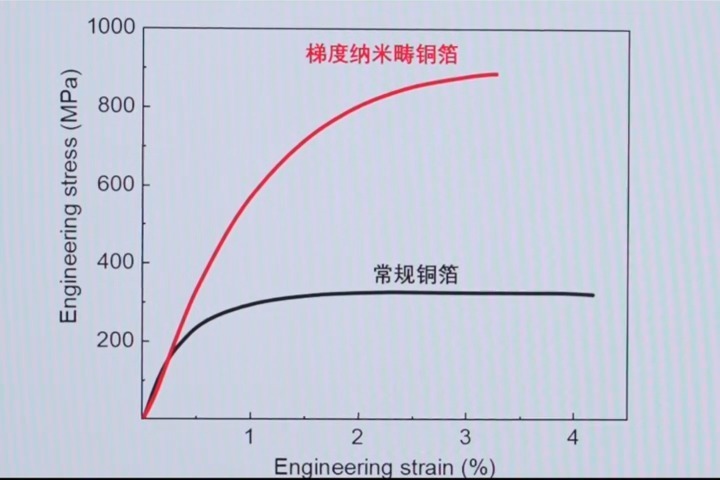 •导电无损:“超级铜箔”不仅强度大幅提升,导电率依然高达高纯铜的90%。和强度相当的传统铜合金比,它的导电能力足足高出约两倍,真正做到了又强又导电,二者兼得。