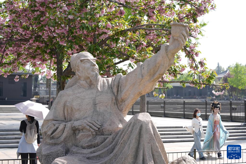 人们在西安市大雁塔北广场上诗人李白造型的雕塑附近游玩(4月9日摄)。新华社记者 邵瑞 摄