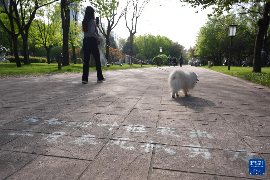 市民在位于西安曲江新区的唐诗文化主题公园散步(4月9日摄)。新华社记者 邵瑞 摄