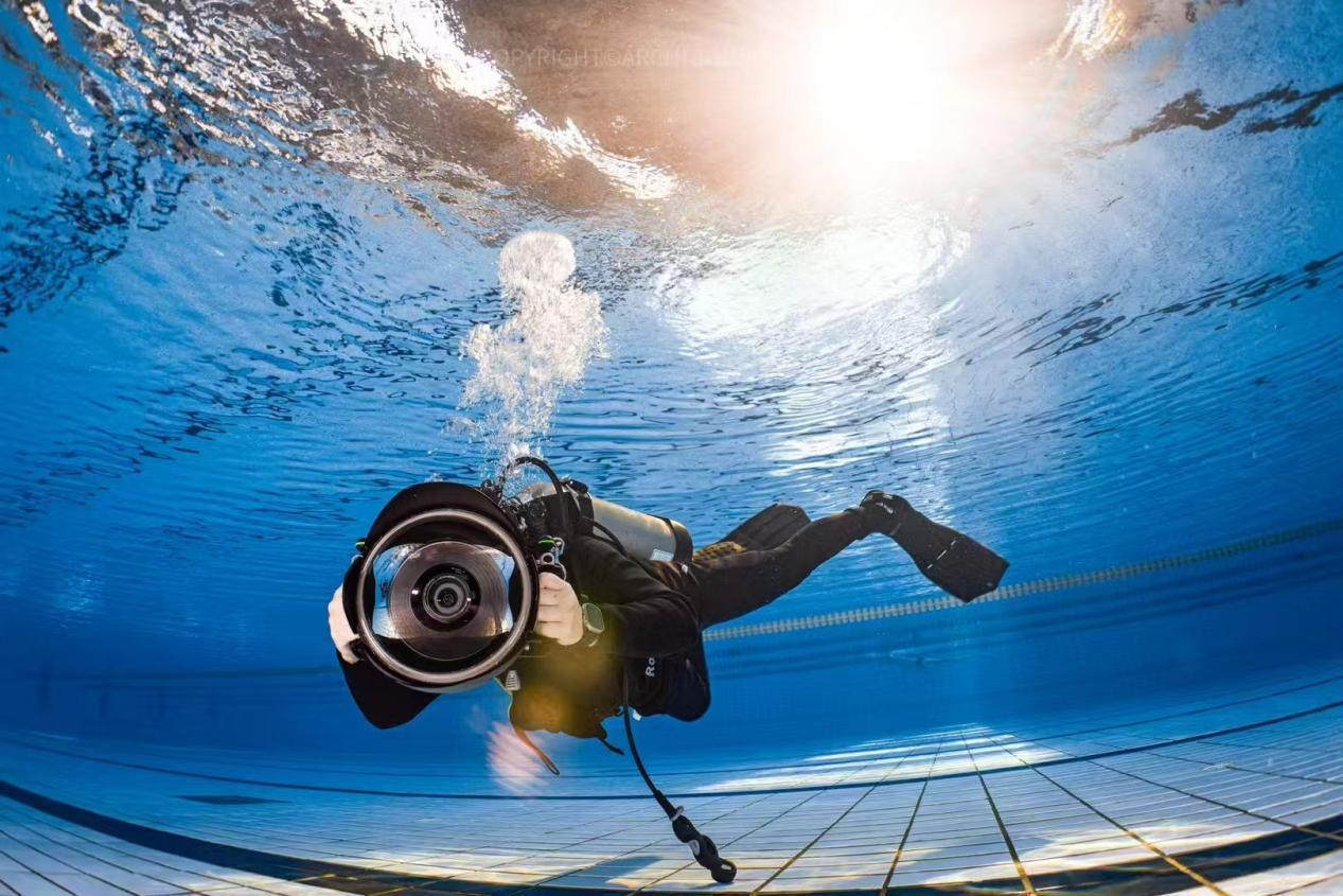 黄心驰在潜水池进行水下拍摄训练。