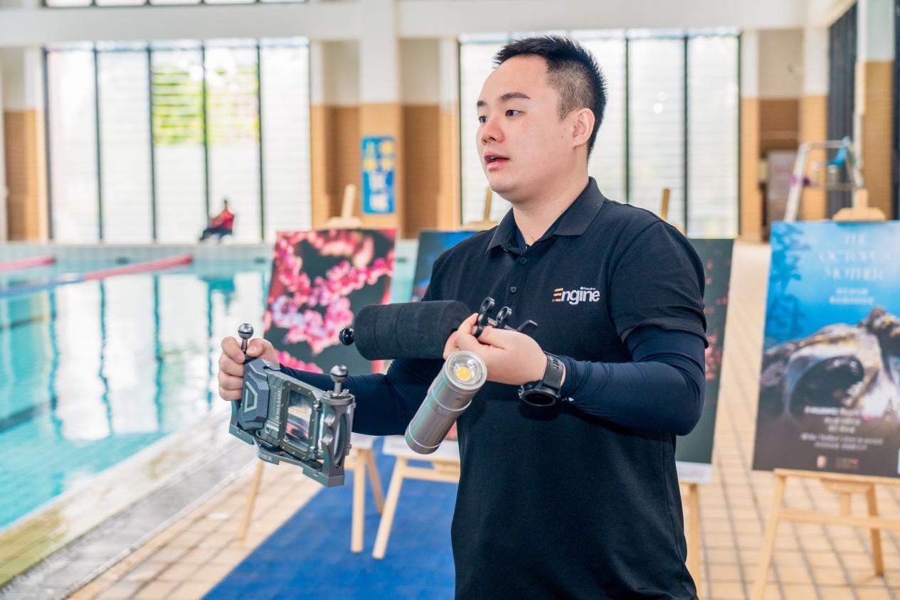 课堂上,黄心驰为学员介绍水下摄影装备。