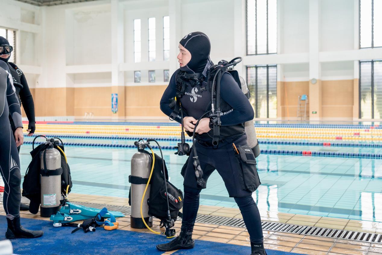 黄心驰为学员演示如何穿戴潜水设备。