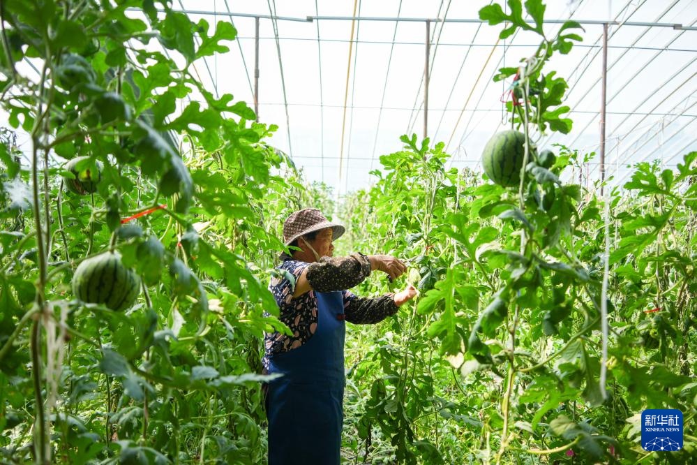 4月17日,在潍坊市昌乐县五图街道,一名瓜农在查看成熟的小型西瓜。新华社记者 徐速绘 摄
