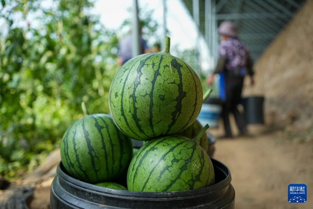 4月17日,在潍坊市昌乐县五图街道,瓜农在收获成熟的小型西瓜。新华社记者 徐速绘 摄