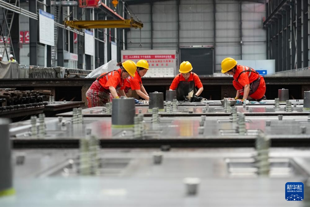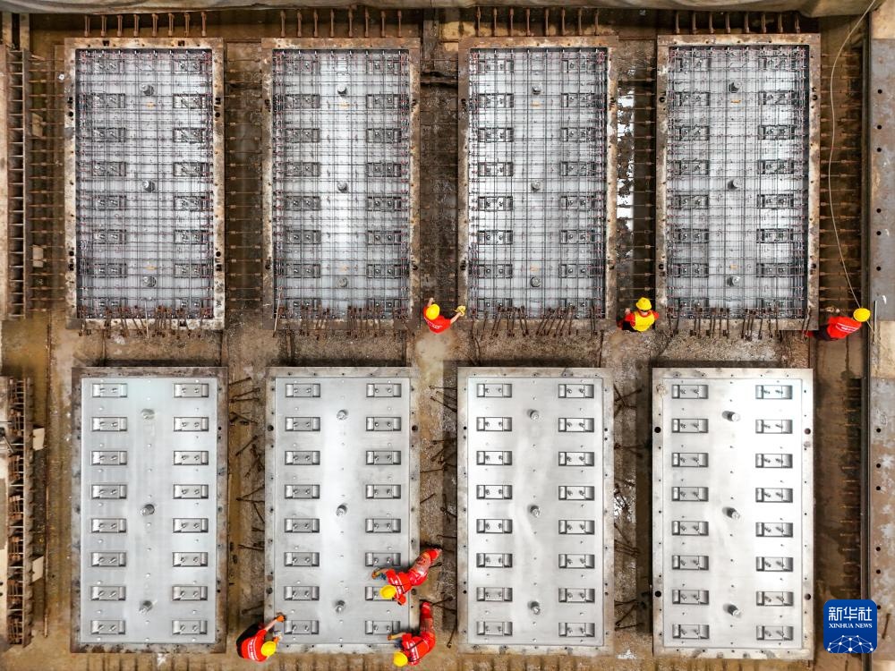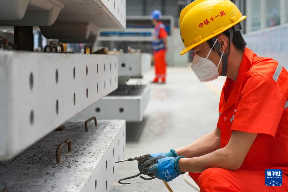 4月17日,在成渝中线高铁安岳制板厂,工人进行混凝土轨道板施工作业。新华社记者 王曦 摄