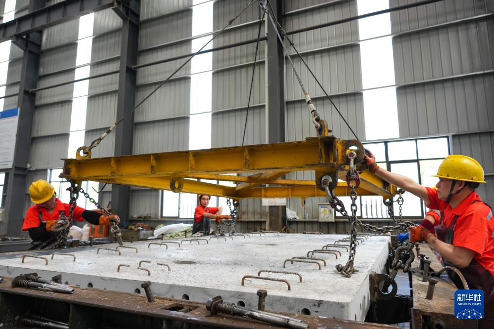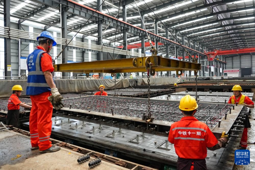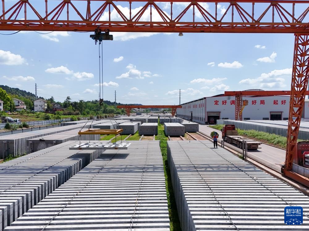 4月17日,在成渝中线高铁安岳制板厂,工人指挥龙门吊吊运轨道板准备发运。新华社记者 王曦 摄