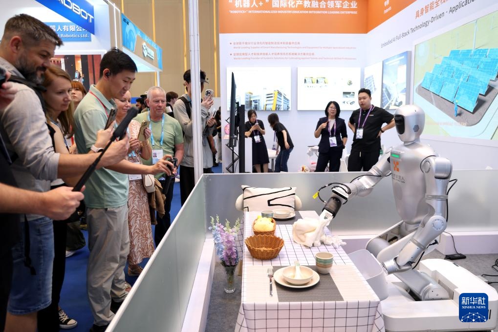 4月15日,境外采购商在广交会上观看机器人模拟收拾餐桌。新华社记者 卢汉欣 摄