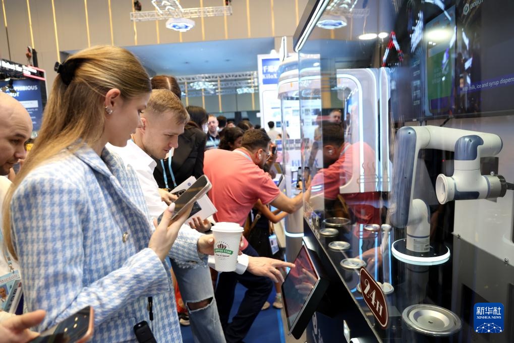 4月15日,境外采购商在广交会上体验自动咖啡机器人。新华社记者 卢汉欣 摄