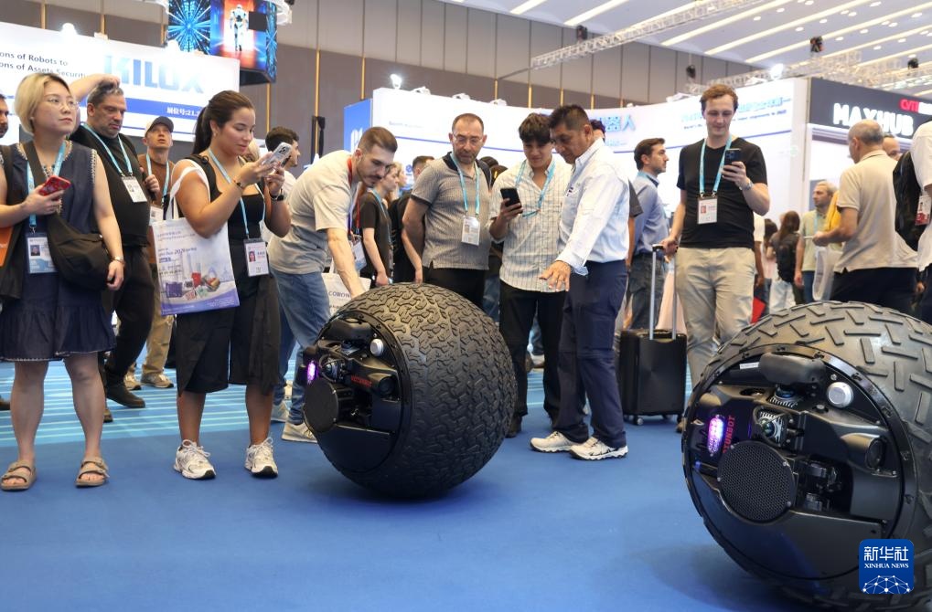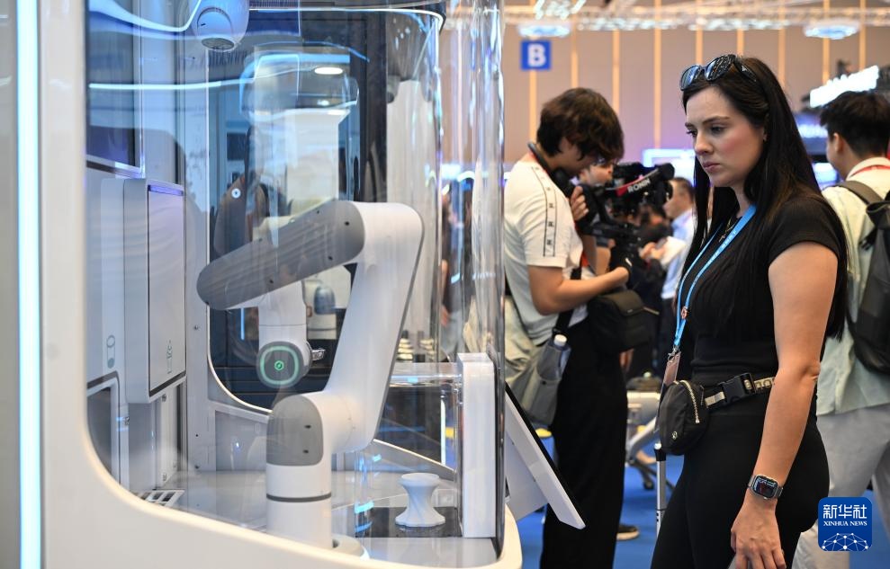 4月15日,境外采购商在广交会上观看自动冰激凌机器人。新华社记者 邓华 摄