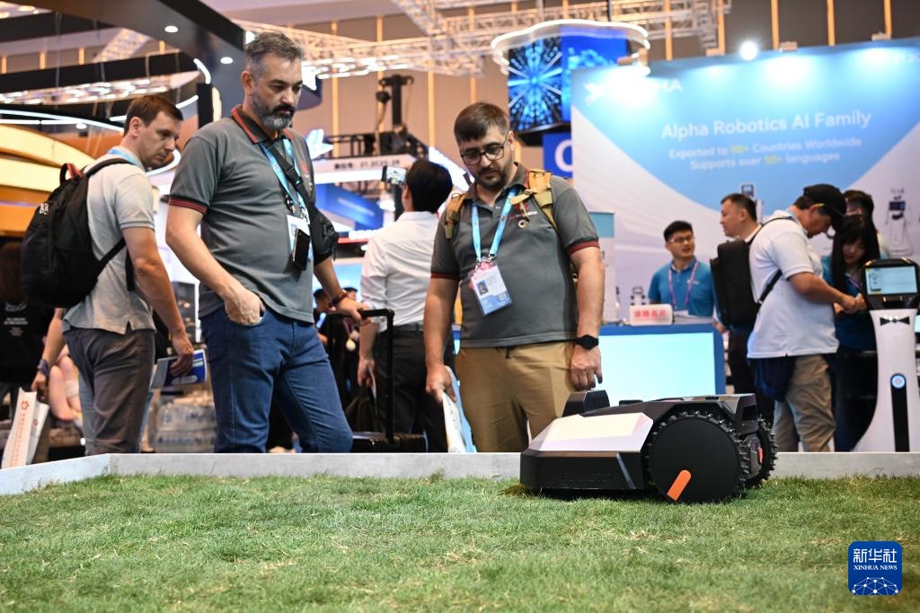 4月15日,境外采购商在广交会上观看一款除草机器人。新华社记者 邓华 摄