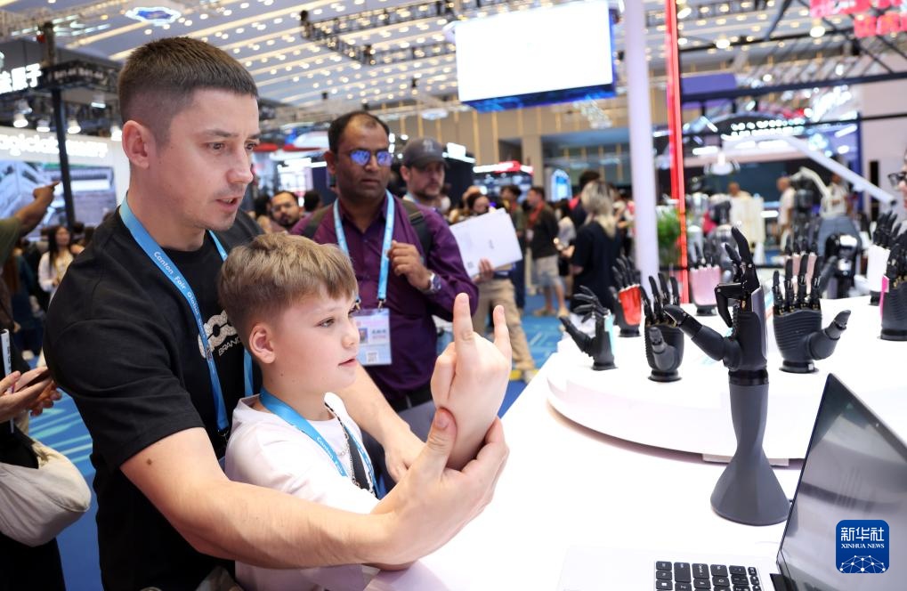 4月15日,境外采购商带着孩子在广交会上和灵巧手互动。新华社记者 卢汉欣 摄