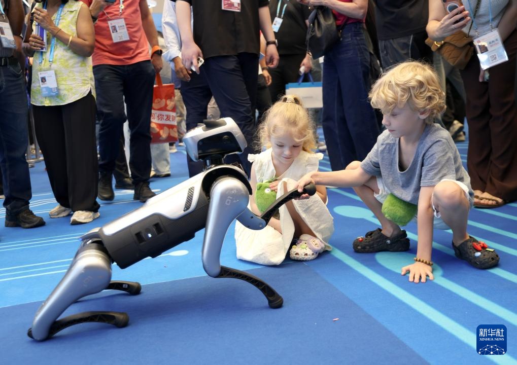 4月15日,小朋友在广交会上和机器狗握手。新华社记者 卢汉欣 摄