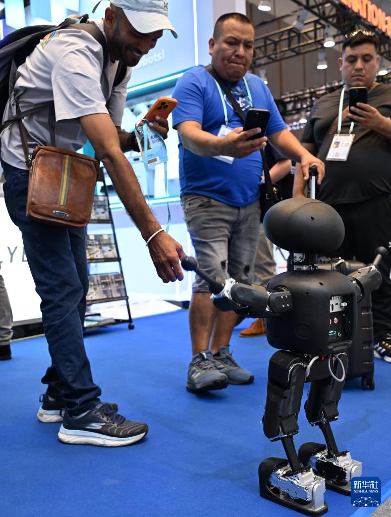 4月15日,境外采购商在广交会上和一款桌面级人形机器人互动。新华社记者 邓华 摄