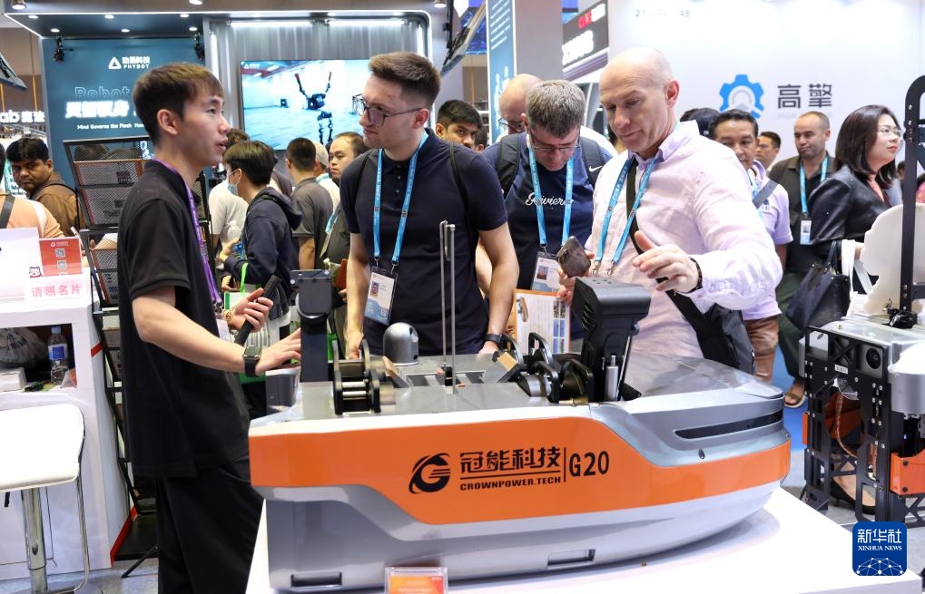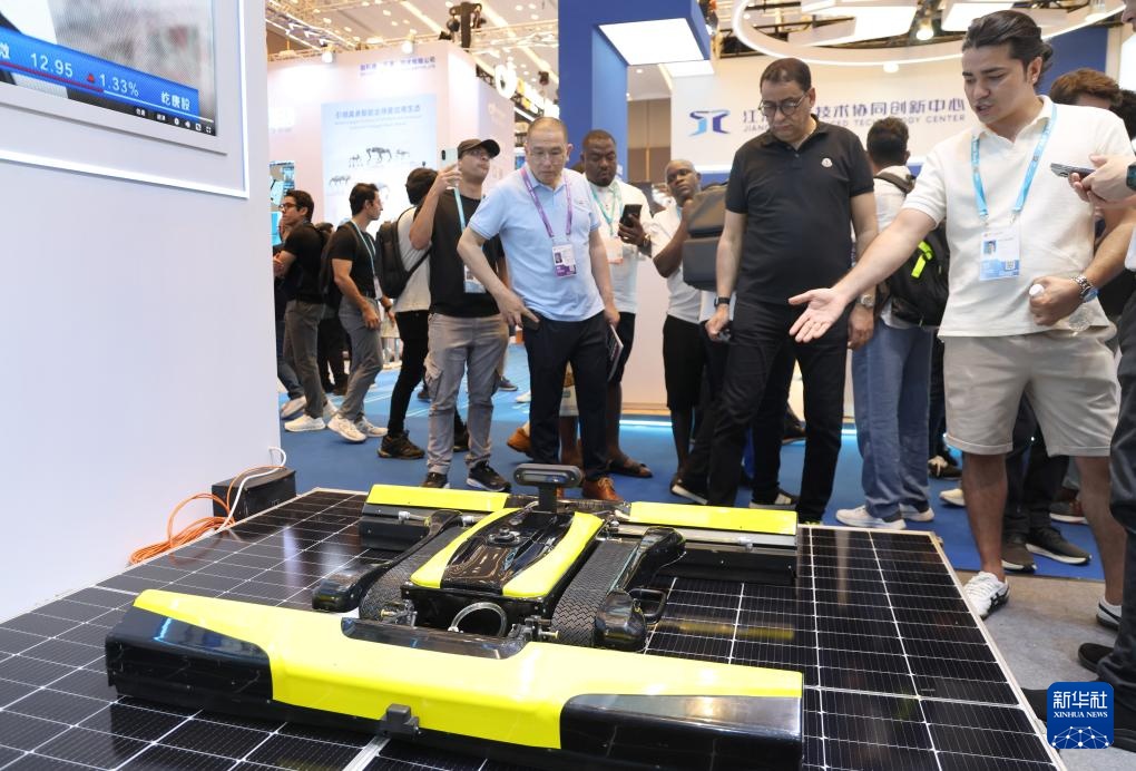 4月15日,境外采购商在广交会上参观了解一款光伏板清洁机器人。新华社记者 卢汉欣 摄
