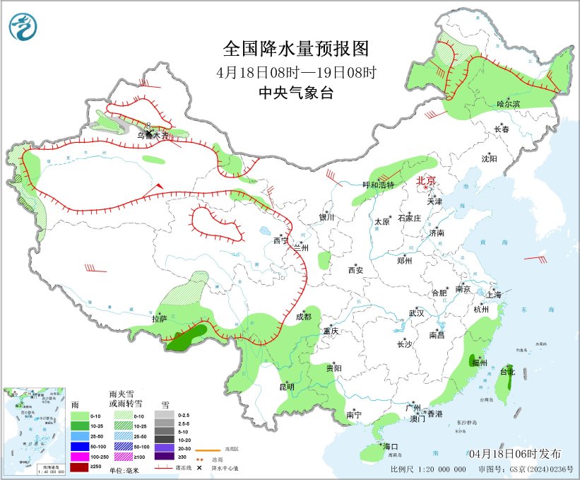 4月18日08时至19日08时,内蒙古东北部、新疆沿天山一带和南疆西部山区、西藏东北部等地部分地区有小到中雨(雪)或雨夹雪,其中,新疆沿天山一带部分地区有中到大雪(5~8毫米);内蒙古中部和东北部、黑龙江中南部、吉林西北部、西藏东南部、四川南部、甘肃河西、河北北部、浙江南部、福建大部、云南西北部和东部、贵州西部、华南南部、海南岛、台湾岛等地部分地区有小到中雨。新疆东北部和南疆盆地、内蒙古、西藏北部、青海西部和北部、甘肃北部、宁夏、陕西北部、河北西北部、黑龙江东南部等地部分地区有5~7级风,阵风8~9级,其中,新疆东北部和南疆盆地、内蒙古中西部局地有8~9级风,阵风10级以上;东海东北部部分海域有7级、阵风8级的东南风。