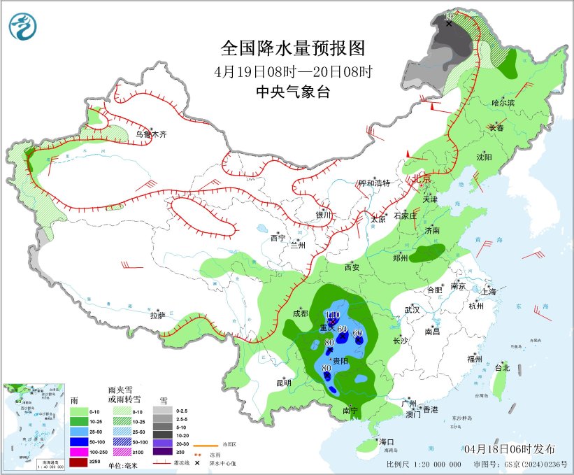 4月19日08时至20日08时,内蒙古东北部、黑龙江西北部、新疆南疆西部山区、西藏西北部等地部分地区有小到中雪或雨夹雪,其中,内蒙古东北部、黑龙江西北部等地部分地区有大到暴雪(10~19毫米);黑龙江中部、黄淮中部,西南地区东部、湖北西南部、湖南西部、广西等地部分地区有中到大雨,其中,重庆中西部、贵州中部和东北部、湖南西部、广西西北部等地部分地区有暴雨或大暴雨(100~110毫米)。新疆东部和南疆盆地、西藏北部和西部、青海东北部、甘肃北部和东部、内蒙古中东部、宁夏、陕西北部、山西中北部、河北中北部、北京西北部、天津、辽宁大部、吉林中西部、黑龙江西南部、河南中东部等地部分地区有5~7级风,阵风8~9级,其中,内蒙古中东部等地部分地区有8~9级风,阵风10级以上;渤海南部部分海域有7级、阵风8级的偏北风。
