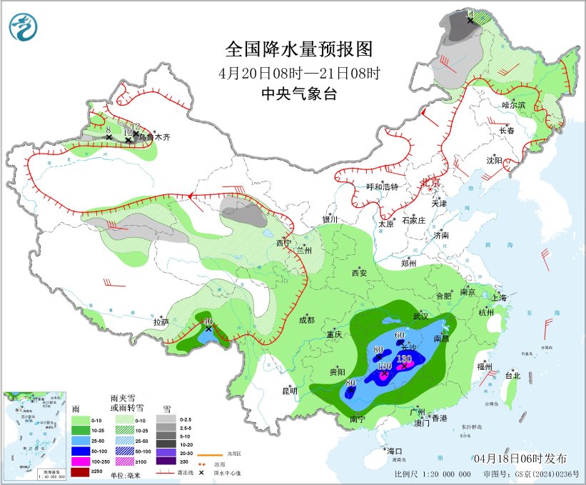 4月20日08时至21日08时,内蒙古东北部、黑龙江、新疆沿天山地区、青海中北部、甘肃中部、西藏北部和东南部等地部分地区有小到中雪或雨夹雪,其中,内蒙古东北部、黑龙江西北部、新疆沿天山地区等地部分地区有大到暴雪(10~19毫米);贵州东部和南部、重庆东南部、湖北南部、江南中西部、华南北部等地部分地区有中到大雨,其中,湖南中南部、广西北部等地部分地区有暴雨或大暴雨(100~130毫米)。内蒙古东北部和中部、黑龙江中部、吉林中部、辽宁南部和西部、新疆南疆盆地、西藏北部、甘肃河西等地部分地区有4~6级风,其中,内蒙古东北部、新疆南疆盆地、甘肃河西等地部分地区有6~7级风,内蒙古中部、青海西部等地部分地区有7~8级风。