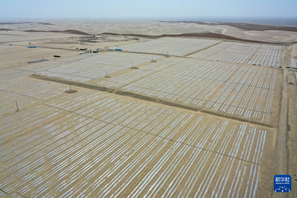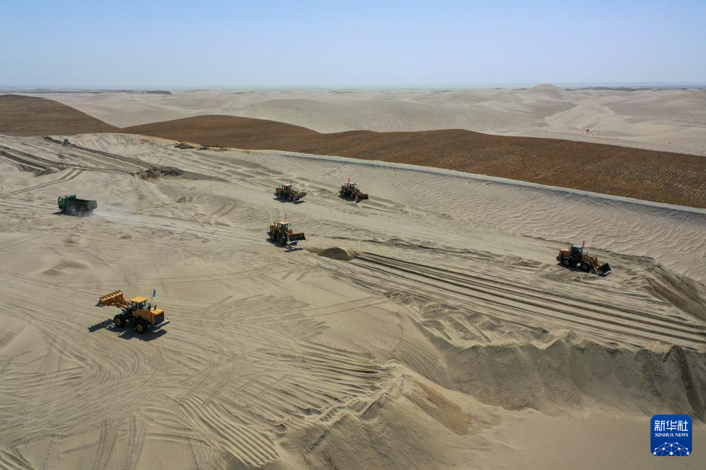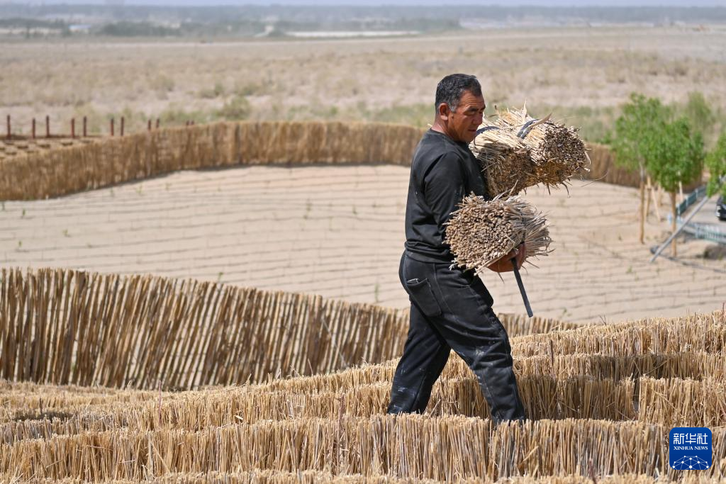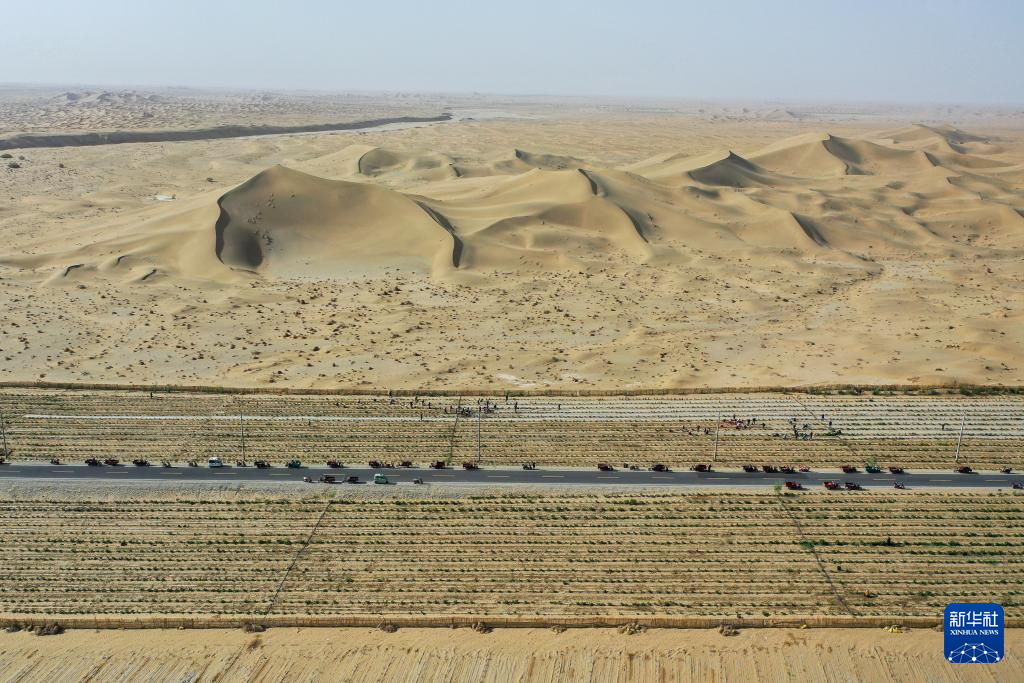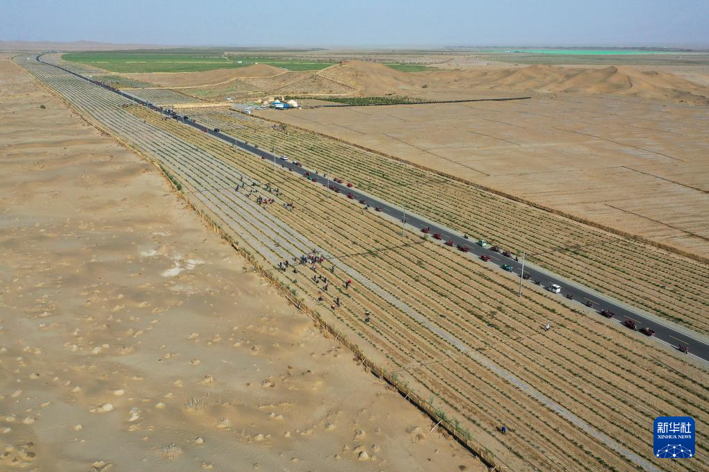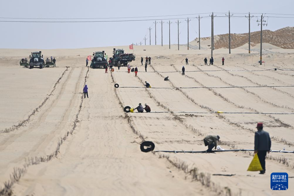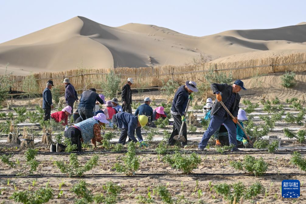 眼下,新疆塔克拉玛干沙漠南缘一派繁忙景象。人们平整沙丘、铺设草方格、嫁接苗木、栽种中药材……塔克拉玛干沙漠边缘治沙正酣。