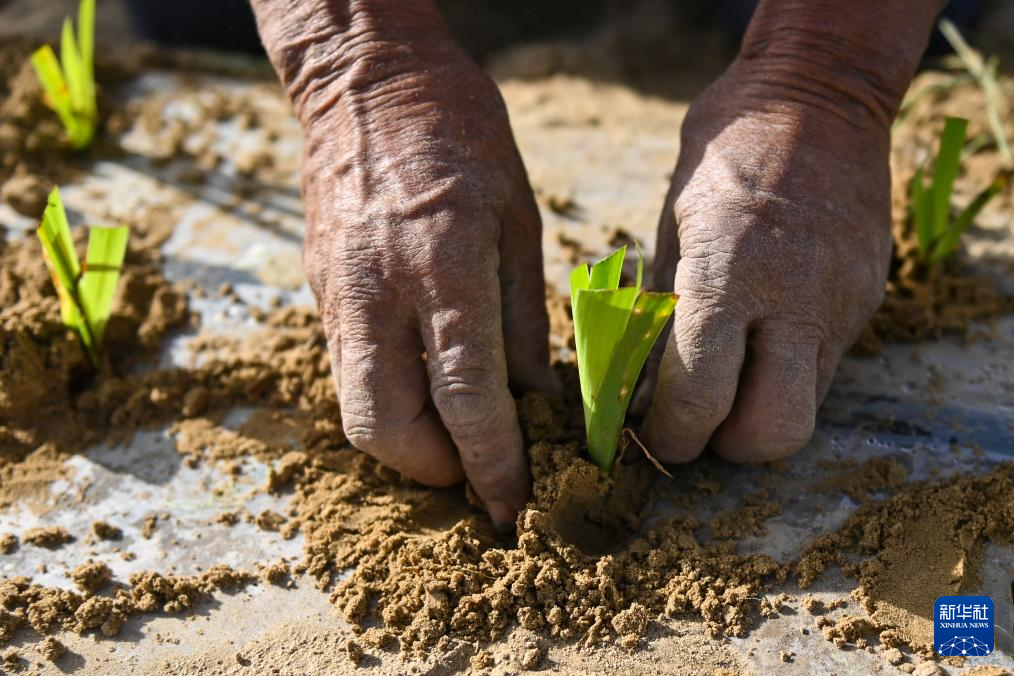 在新疆和田地区于田县万花园防沙治沙示范区,村民栽种中药材射干(4月15日摄)。新华社记者 丁磊 摄