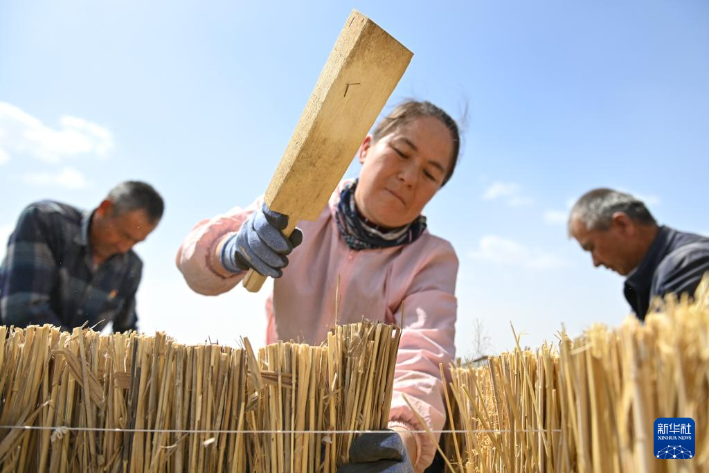 在新疆和田地区于田县阗东防沙治沙示范区,村民制作草方格(4月15日摄)。新华社记者 丁磊 摄