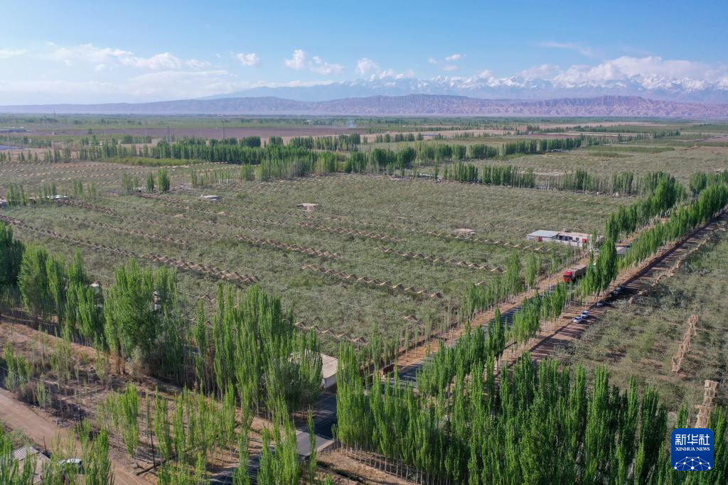 在新疆和田地区和田县三万亩群众防沙治沙区,当地在开心果林地套种南瓜(4月16日摄,无人机照片)。新华社记者 丁磊 摄