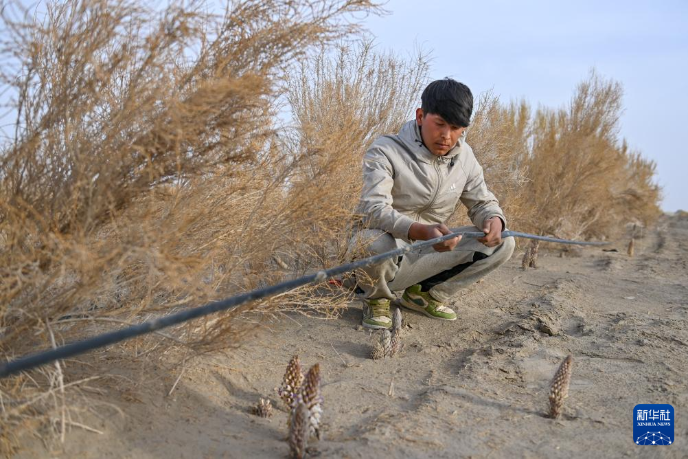 在位于新疆阿克苏地区沙雅县的新疆仙草蓉科技有限公司防沙治沙荒漠植物示范园,工作人员在检查滴灌带(4月13日摄)。新华社记者 丁磊 摄
