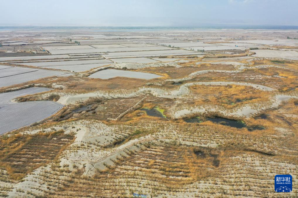 这是新疆阿克苏地区阿瓦提县艾西曼区域生态修复及荒漠化治理工程区一角(4月14日摄,无人机照片)。新华社记者 丁磊 摄