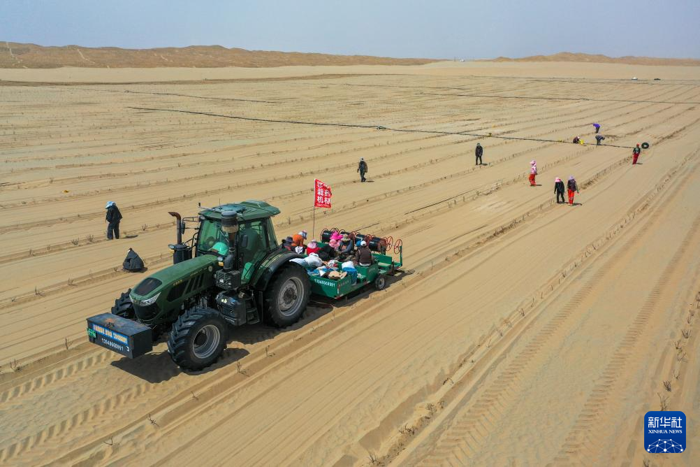 在新疆和田地区于田县阗东防沙治沙示范区,村民驾驶机械移栽玫瑰和黄芩,并铺设滴灌带(4月15日摄)。新华社记者 丁磊 摄
