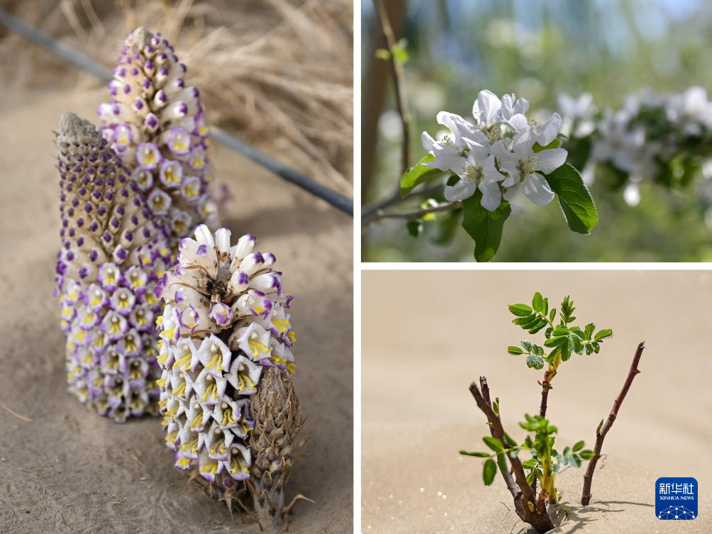 拼版照片:右上为在新疆阿克苏市丰庆园农民专业合作社示范园拍摄的苹果花(4月14日摄);右下为在新疆和田地区于田县阗东防沙治沙示范区拍摄的玫瑰花苗(4月15日摄);左为在新疆仙草蓉科技有限公司防沙治沙荒漠植物示范园拍摄的肉苁蓉(4月13日摄)。新华社记者 丁磊 摄
