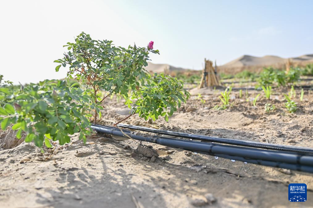 这是在新疆和田地区于田县万花园防沙治沙示范区拍摄的玫瑰花苗(4月15日摄)。新华社记者 丁磊 摄