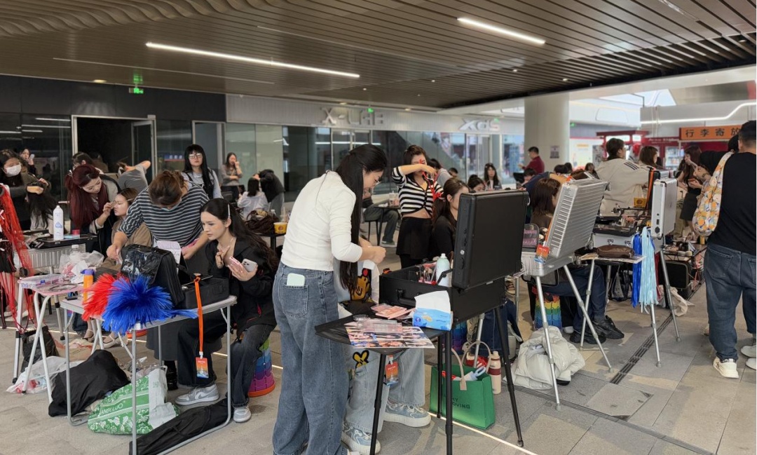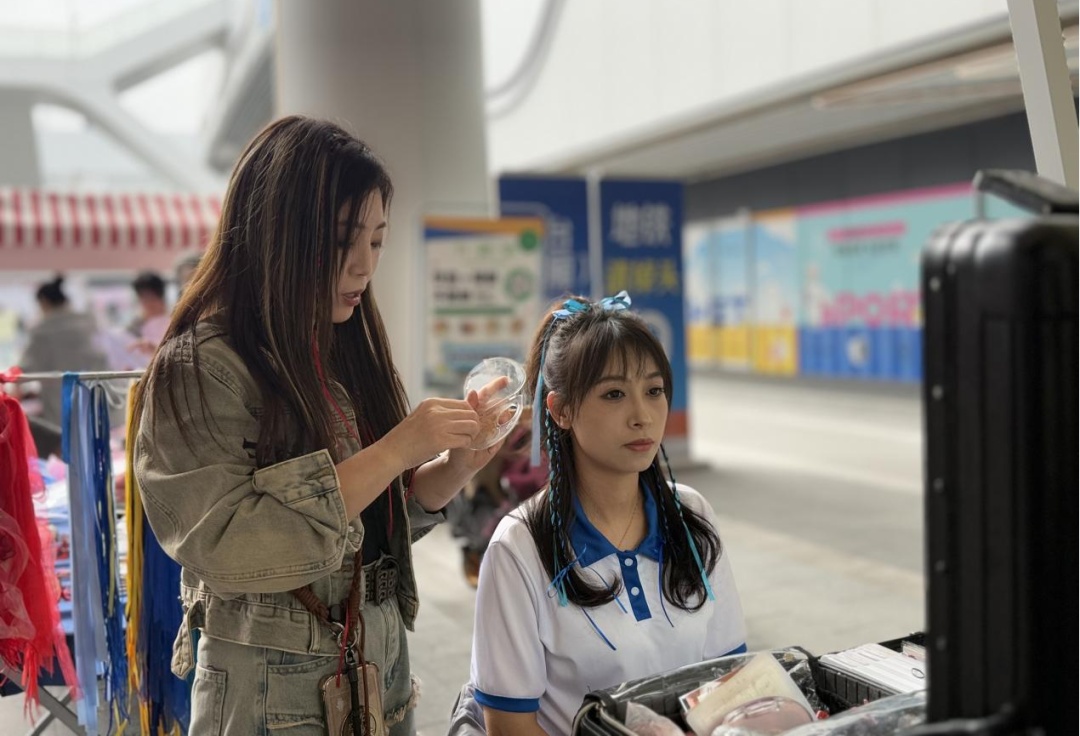 昨日下午三点,距离演唱会开始还有4个小时,杭州奥体中心某场馆外的化妆摊已经一派忙碌景象。“多巴胺”彩色眼影、亮钻贴片、应援色编发……对不少粉丝来说,预约一个专属“应援妆”,已经成为看演唱会的标配。
