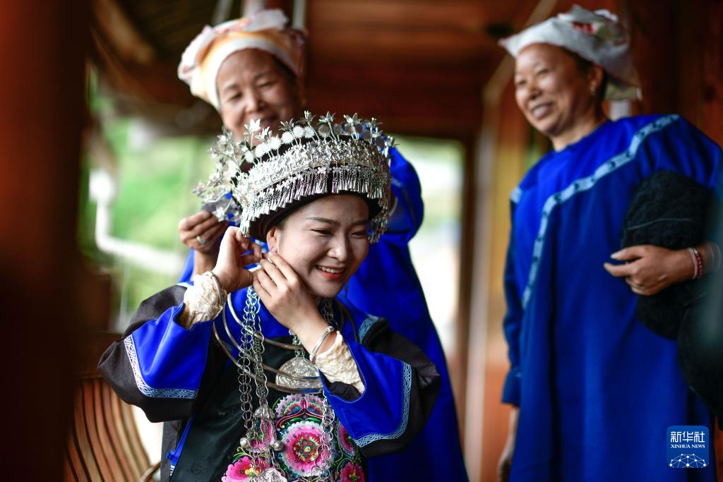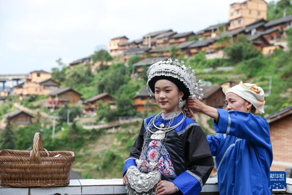 4月19日,在贵州省镇远县报京侗寨,参加“三月三”民俗活动的侗族群众在整理节日服装。新华社记者 杨文斌 摄
