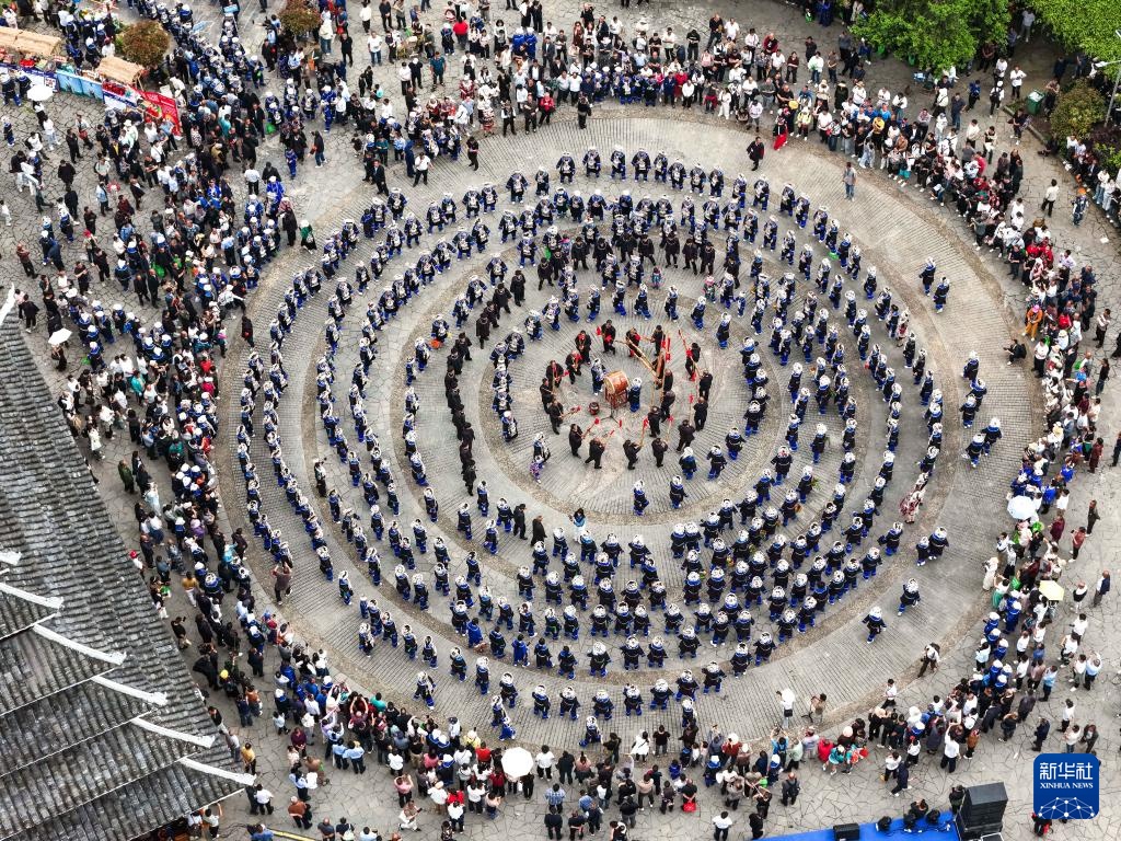 4月19日,人们在贵州省镇远县报京侗寨“三月三”民俗活动中跳团圆舞(无人机照片)。新华社记者 杨文斌 摄