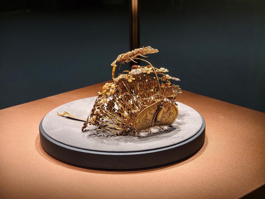 进入展厅,最先映入眼帘的文物便是闹蛾金钗。这件文物出土后状态欠佳,长时间保存在库房中较少展出。这一次是国博文保工作人员历时七八个月修复后的首次展出。包括闹蛾金钗在内,工作人员修复了50余件李静训墓出土文物,大多在本次展览中予以展出。
