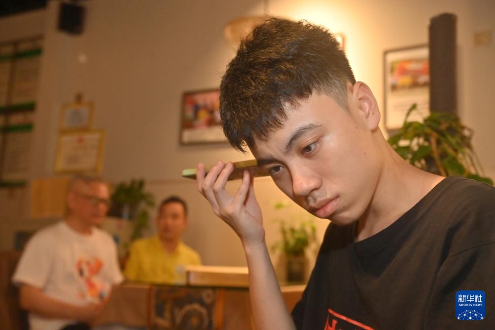 4月22日,在广西南宁明秀东路的盲人读书角,视障人士施奎铭(右一)借助手机语音功能学习。新华社记者 陆波岸 摄
