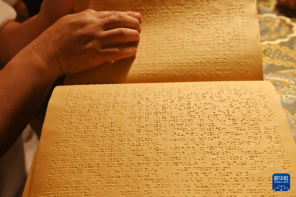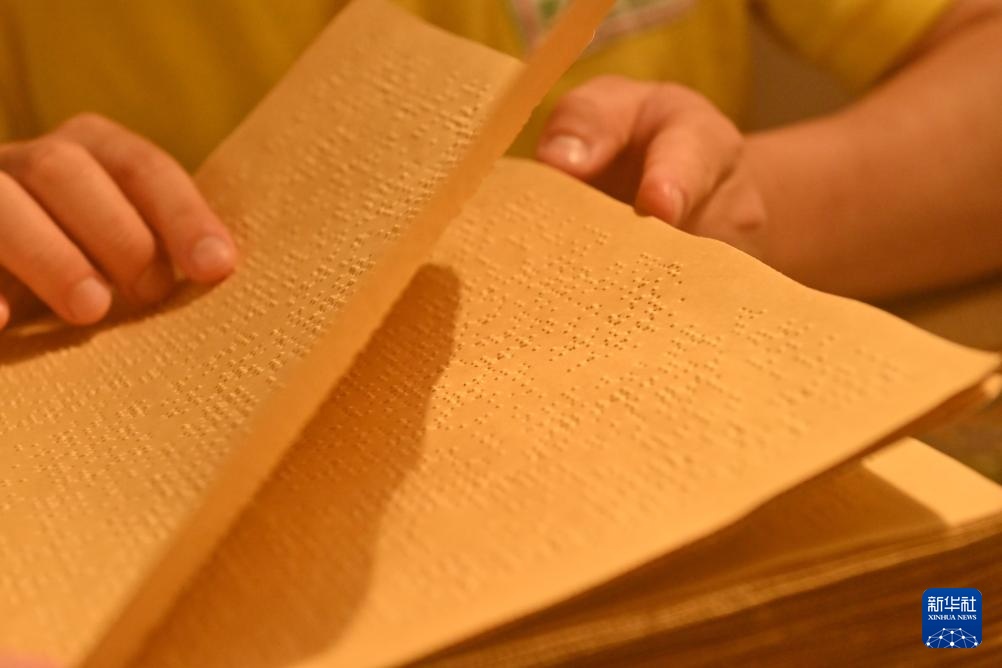 4月22日,在广西南宁市明秀东路的盲人读书角,视障人士曾桥明在阅读盲文书籍。新华社记者 陆波岸 摄