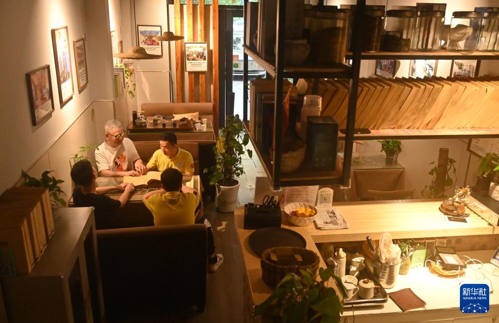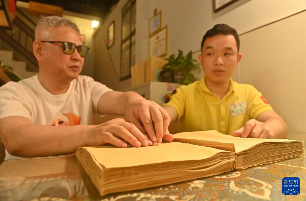 4月22日,在广西南宁市明秀东路的盲人读书角,视障人士曾桥明(右)在广西盲人协会主席陶进指导下学习盲文知识。新华社记者 陆波岸 摄