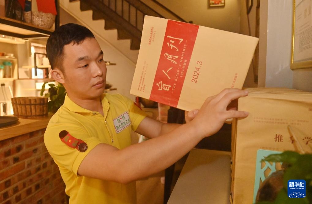4月22日,在广西南宁市明秀东路的盲人读书角,视障人士曾桥明学习后将书放回原处。新华社记者 陆波岸 摄