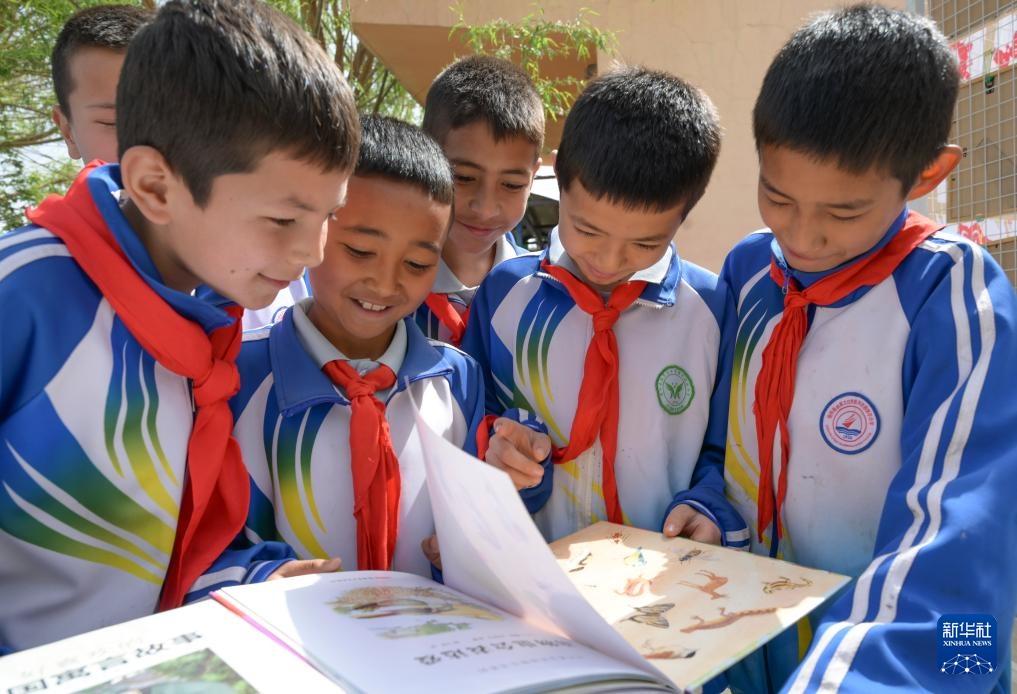 4月21日,在新疆新和县依其艾日克镇木纳尔村小学,小朋友们在“图书巴扎”上阅读图书。新华社记者 王菲 摄