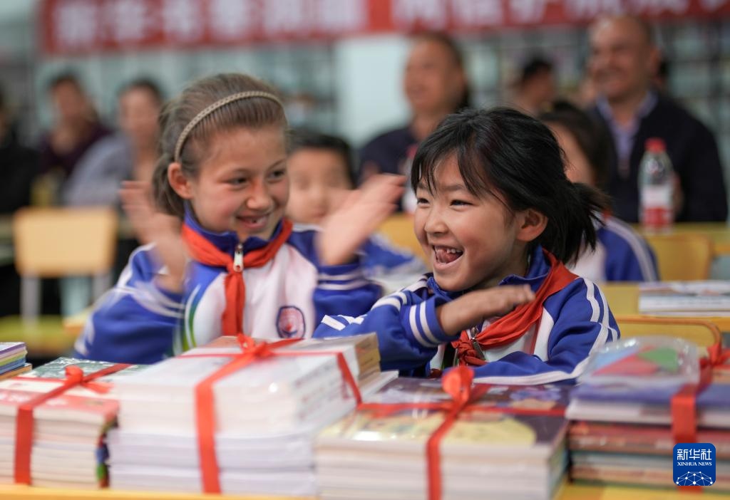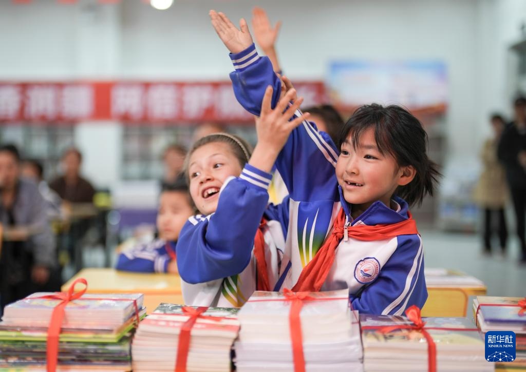 4月21日,在新疆新和县依其艾日克镇依其艾日克村,小朋友高兴地领取到赠送的书籍。新华社记者 王菲 摄