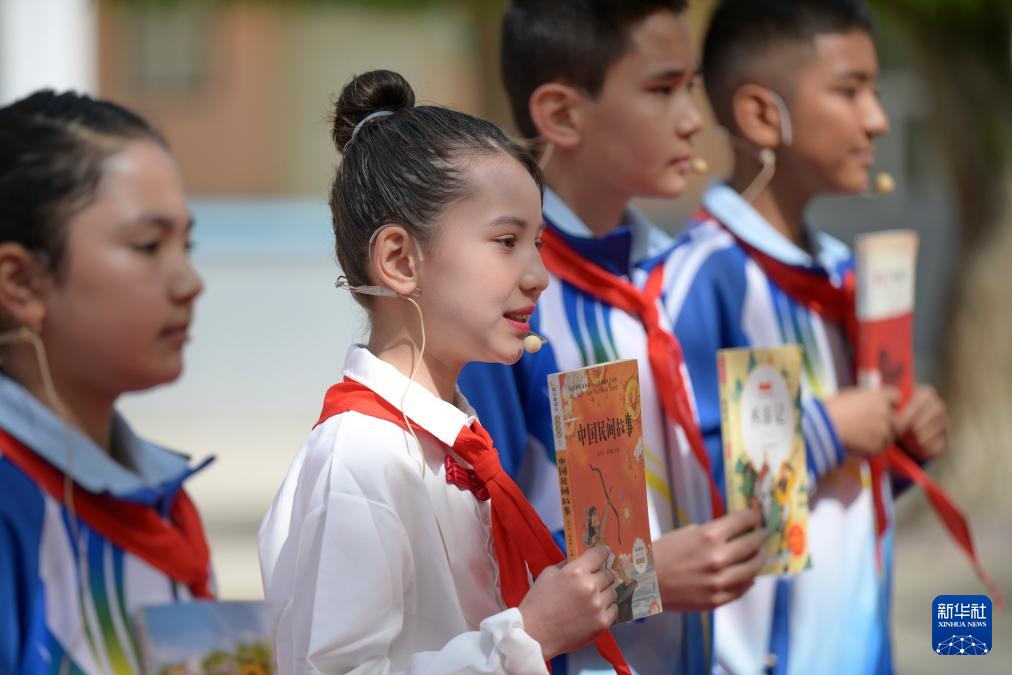 4月21日,在新疆新和县依其艾日克镇托特塔什村,小朋友在表演经典诵读。新华社记者 王菲 摄