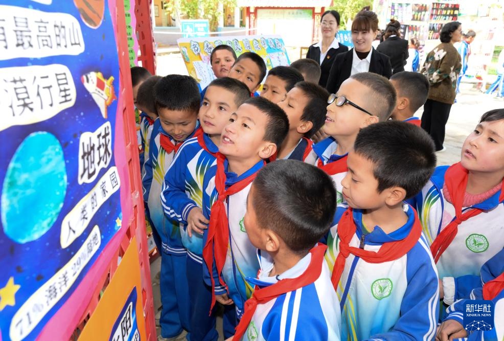 4月21日,在新疆新和县依其艾日克镇木纳尔村小学,小朋友们在“图书巴扎”上阅读书籍海报。新华社记者 王菲 摄
