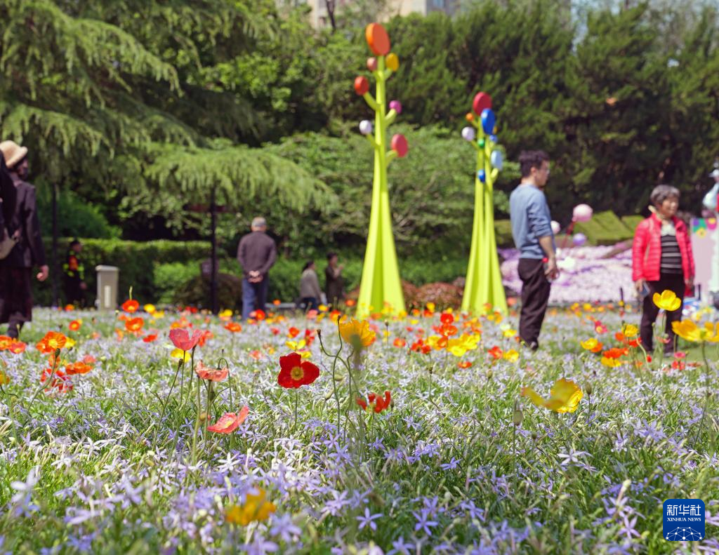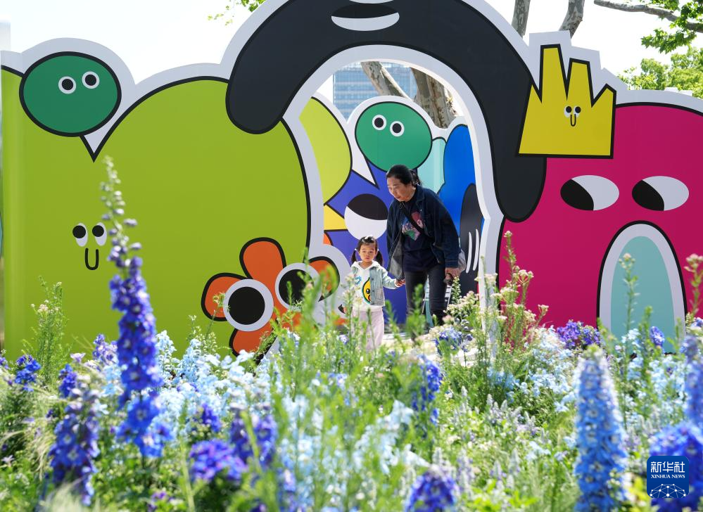 4月24日,在上海市中山公园,人们在花卉置景前游玩。新华社记者 刘颖 摄