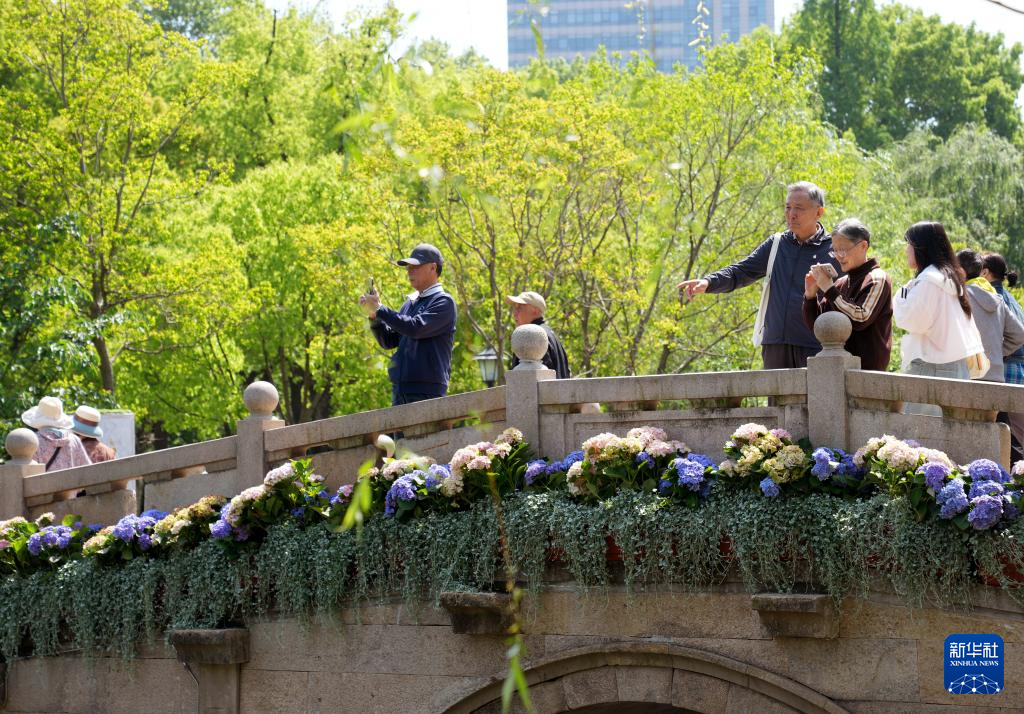 4月24日拍摄的被鲜花装点的上海中山公园十二景点之一“虹桥蒸雪”。新华社记者 刘颖 摄