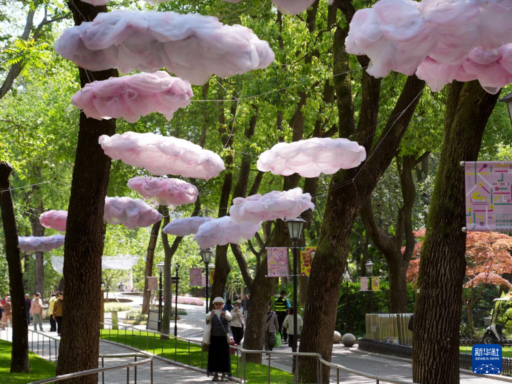 4月24日,在上海市长宁区的苏州河步道,人们在形似云霞的置景下拍照。新华社记者 刘颖 摄