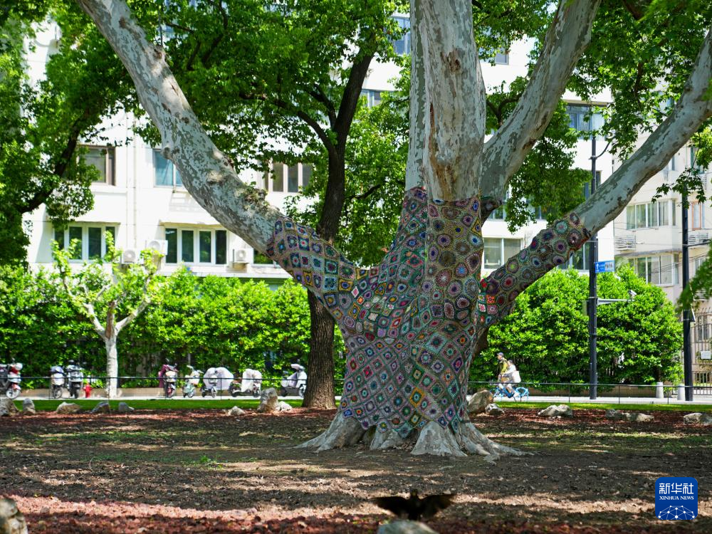 上海市中山公园门前的编号0909悬铃木古树“穿”上了非遗技艺编织的“花衣”,花卉织艺与古树肌理相融,展现出自然之美和手工之韵(4月24日摄)。新华社记者 刘颖 摄