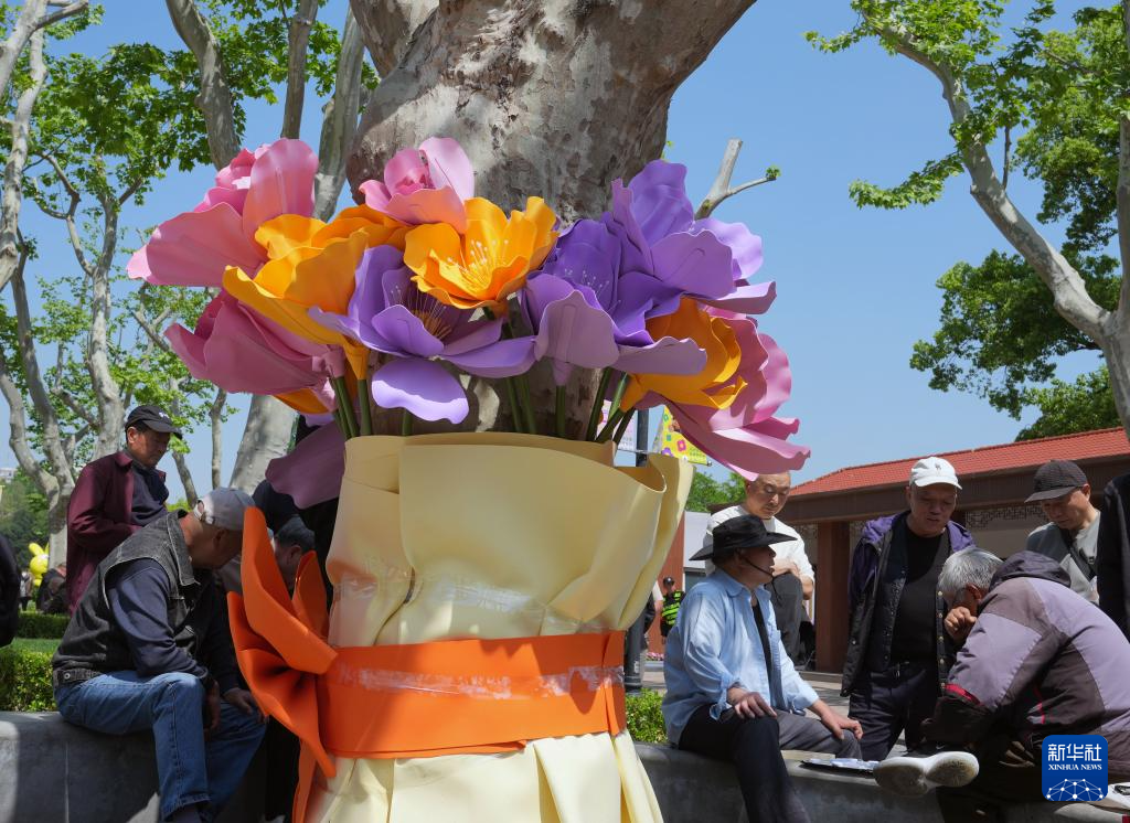 4月24日,在上海市中山公园,人们在装点着花朵置景的大树旁下棋。新华社记者 刘颖 摄